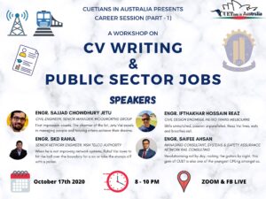 Dear All, CUETians in Australia is going to arrange “Career Session Part-2” on January 30, 2021, from 6 pm to 8 pm (AEDT). There will also be a panel discussion where students and the audience can ask questions to the peers about the career pathways and other important issues. This event will also be a chance to get to know the peers and an opportunity to expand your network. Topics to be covered: a) IT and Network Engineering b)Mechanical Building…